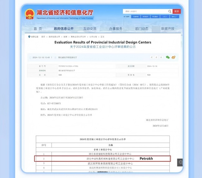 On December 16, 2024, Hubei Provincial Department of Economy and Information Technology announced the "2024 Evaluation Results of Provincial Industrial Design Centers", and our company Hubei Petrokh Machine Manufacturing Co., Ltd was officially recognized as the "Provincial Industrial Design Center 2024".